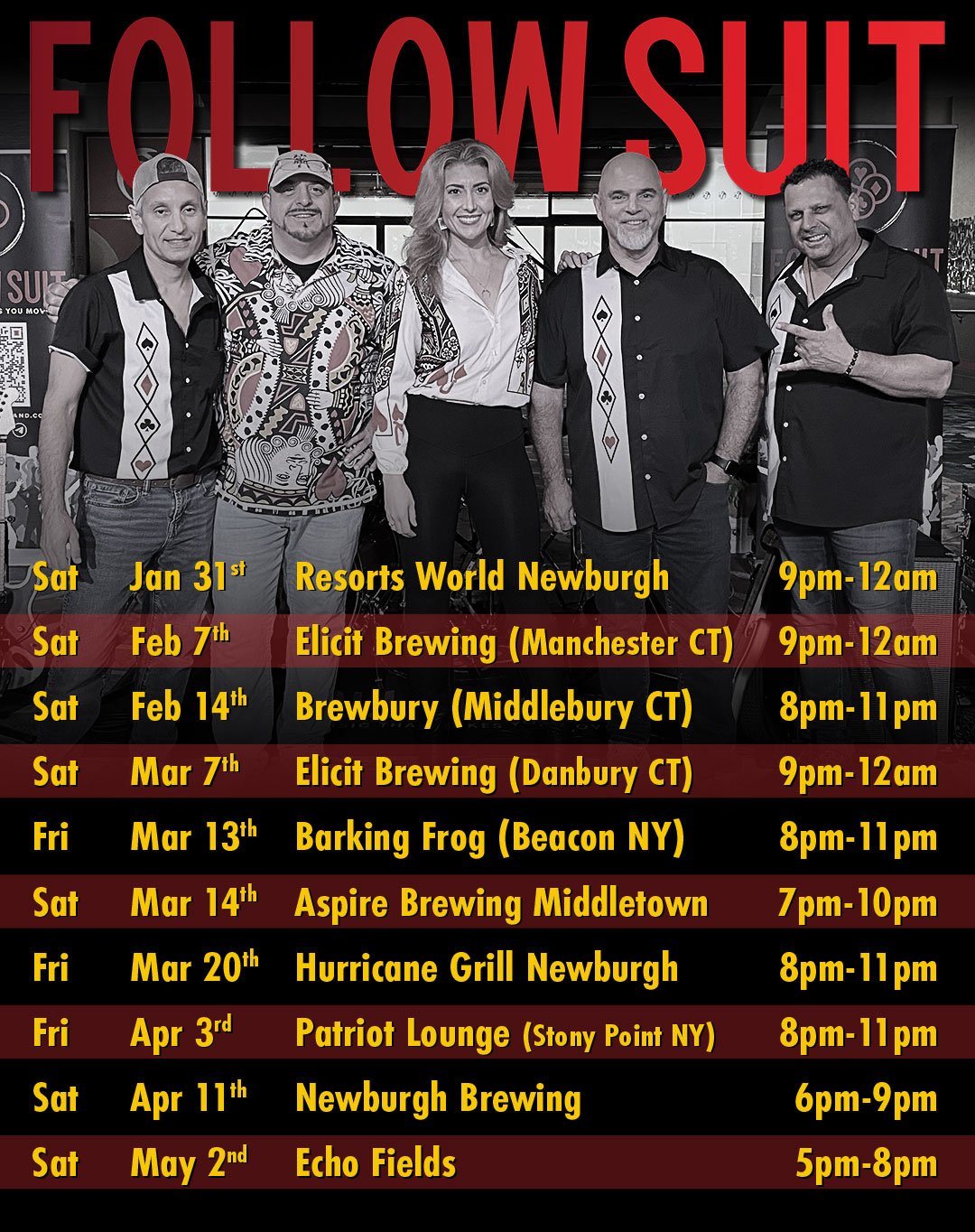 UPCOMING SHOWS FOR FOLLOW SUIT Visit our Facebook Events page RSVP to our upcoming events and Follow Us on Social Media!